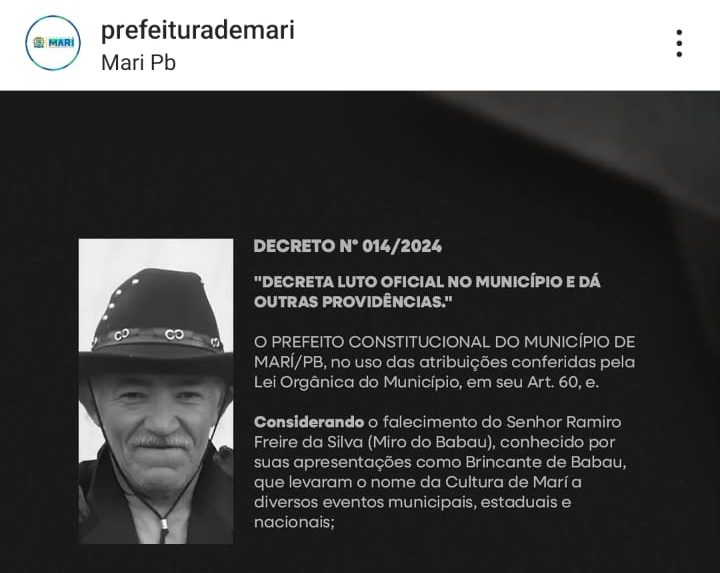 Somente após a repercussão da matéria publicada pelo Portal ExpressoPB.net, contendo críticas a gestão municipal por seu silêncio diante da morte de Mestre Miro do Babau, a Prefeitura de Marí resolveu se pronunciar sobre o falecimento do ícone cultural. No final da tarde de hoje (03), a administração municipal publicou em seu perfil no Instagram um decreto de luto oficial pela morte de Miro, datado de 30 de novembro. Entretanto, o decreto parece mais uma tentativa de apagar o erro do que uma homenagem sincera, pois até então ninguém tinha conhecimento do documento, e nenhuma rede social da Prefeitura havia registrado sua existência na data indicada.