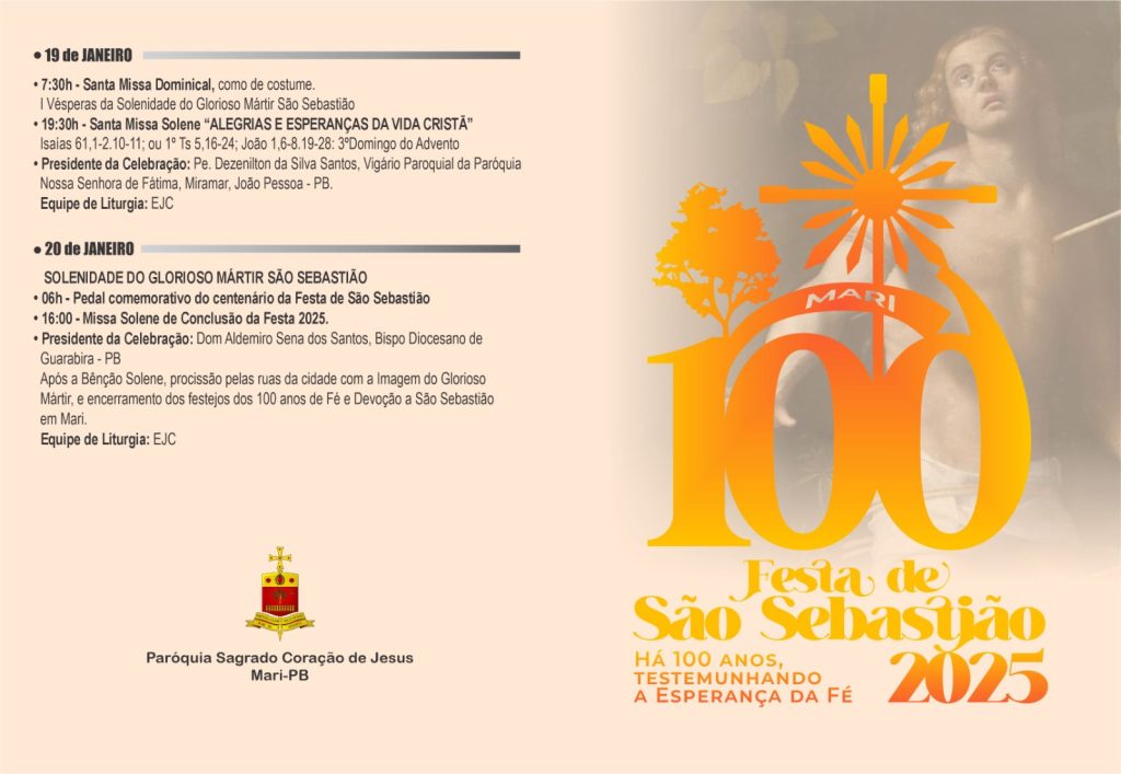 O tradicional Novenário de São Sebastião em Marí, que celebra 100 anos de história e fé, terá sua abertura solene nesta sexta-feira (10), à noite, na Paróquia do Sagrado Coração de Jesus. O evento promete atrair fiéis de toda a região, reafirmando a devoção secular ao santo. Celebração de Abertura com Dom Lucena A missa […]
