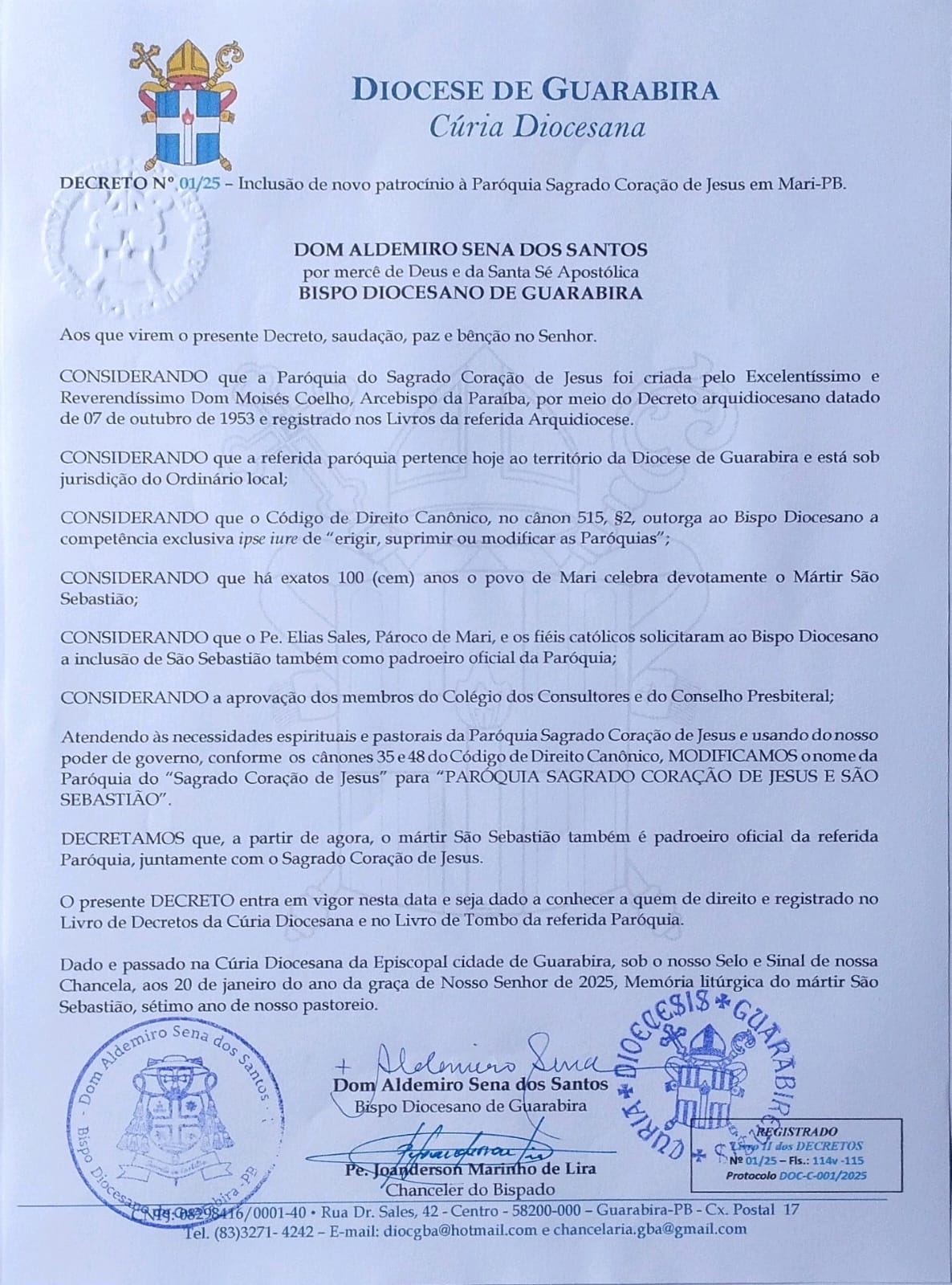 A Diocese de Guarabira anunciou oficialmente, por meio de decreto assinado pelo bispo Dom Aldemiro Sena dos Santos, a inclusão de São Sebastião como padroeiro da cidade de Mari (PB). Com isso, o município passa a contar com dois padroeiros: o Sagrado Coração de Jesus e São Sebastião, fortalecendo ainda mais a tradição e a identidade religiosa da comunidade.