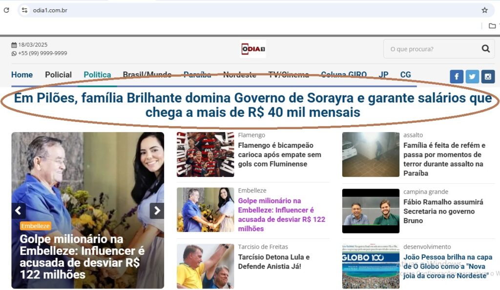 Uma reportagem publicada na tarde desta terça-feira (18) no site da Agência de Notícias ODIA1 revela um forte domínio da família Brilhante sobre a administração municipal de Pilões, cidade do brejo paraibano, pujante por suas belezas naturais e aconchegante por natureza. A referida matéria aponta a influência da ex-prefeita Socorro Brilhante e de seu filho, […]