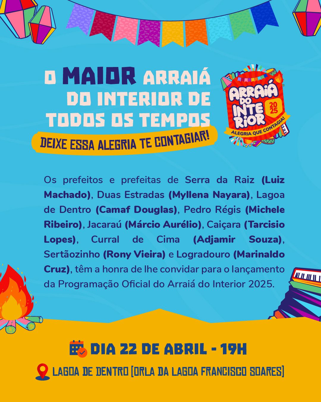 A programação do Arraiá do Interior 2025 teve seu lançamento oficial antecipado para dia 22, na Orla da Lagoa Francisco Soares, em Lagoa de Dentro, a partir das 19h. Além da expectativa para conhecer as atrações musicais, já se sabe que eventos como festivais de quadrilhas juninas, feiras de artes e gastronomia, apresentações culturais e artísticas com grupos locais devem compor o roteiro festivo.