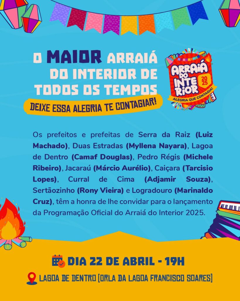 A programação do Arraiá do Interior 2025 teve seu lançamento oficial antecipado para dia 22, na Orla da Lagoa Francisco Soares, em Lagoa de Dentro, a partir das 19h. Além da expectativa para conhecer as atrações musicais, já se sabe que eventos como festivais de quadrilhas juninas, feiras de artes e gastronomia, apresentações culturais e […]