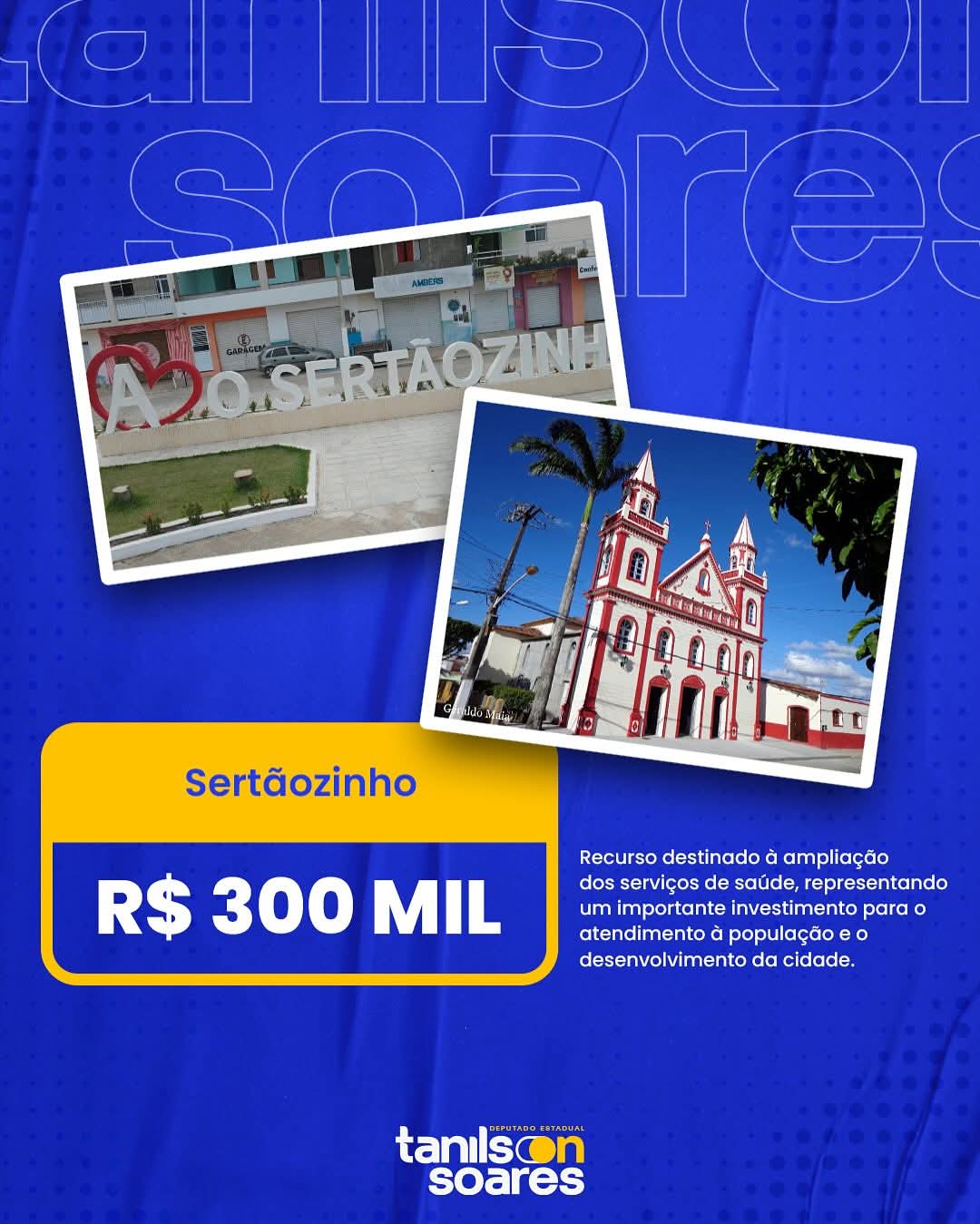 “Vamos de mais prestação de contas! Destinei, para 2025, uma emenda no valor de R$ 300 mil para o município de Sertãozinho, com o objetivo de construir novos equipamentos de saúde e ampliar os já existentes. Essa ação vai fortalecer e expandir os serviços de atenção à saúde para toda a população. Vamos em frente, nosso trabalho continua!”, escreveu Tanilson.