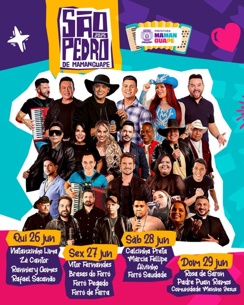 A programação oficial do São Pedro 2025 de Mamanguape foi divulgada nesta sexta-feira (25), durante um evento realizado na Praça da Matriz da cidade. Este ano, as festividades do maior São Pedro da Paraíba acontecerão de 26 a 29 de junho e contarão com grandes atrações como Natanzinho Lima, Calcinha Preta, Rafael Sacanão, Vitor Fernandes, […]