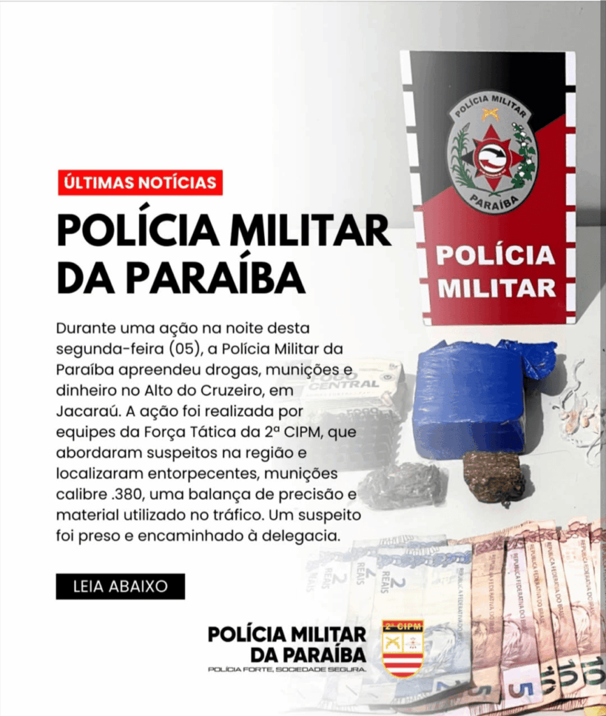 A polícia militar por meio da força tática realizou uma operação na noite da segunda-feira (05), no alto do cruzeiro em Jacaraú, litoral norte da Paraíba. De acordo com as informações, com o suspeito preso foi apreendido 10 trouxinhas de substâncias semelhantes a crack, 300g de substâncias semelhantes a maconha, dinheiro fracionado, balança de precisão […]