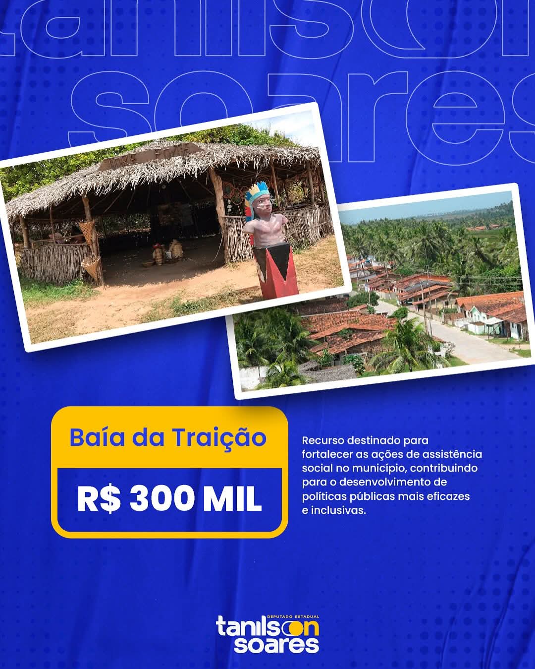 O deputado estadual, Tanilson Soares realizou, nesta quarta-feira (07), através de suas redes sociais, mais uma prestação de contas, onde divulgou a destinação de uma emenda parlamentar no valor de R$ 300 mil para o município de Baía da Traição, que será voltado ao fortalecimento das ações de assistência social na cidade e deverá ser executado ainda este ano.