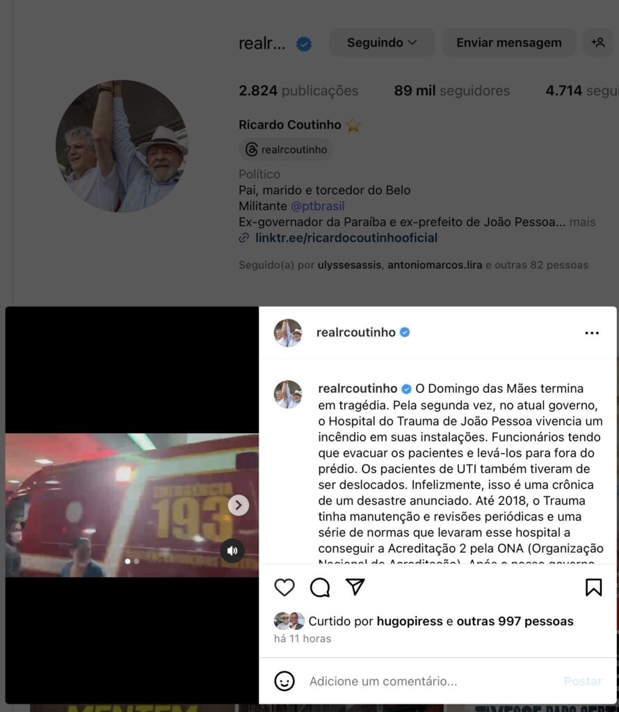RC crítica descaso na saúde na gestão de João Azevêdo e Jhony Bezerra que causou 2º incêndio no Trauma de JP em cinco meses