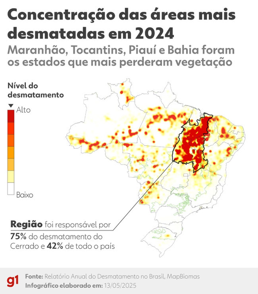 Segundo o estudo do Mapbiomas, os estados do Maranhão, Tocantins, Piauí e Bahia, região conhecida como Matopiba, concentrou 75% do desmatamento do Cerrado e cerca de 42% de toda a perda de vegetação nativa no país.