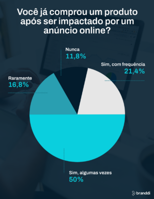 Mas, mesmo que, atualmente, os anúncios sejam alvo de golpes digitais, eles também são uma forma eficaz de conectar marcas aos perfis de consumidores desejados, divulgando seus produtos e serviços. Segundo o estudo, 71% dos entrevistados afirmaram que já compraram após serem impactados por propagandas online, sendo que, desses respondentes, 50% disseram adquirir produtos ou serviços algumas vezes, e 21% com frequência.