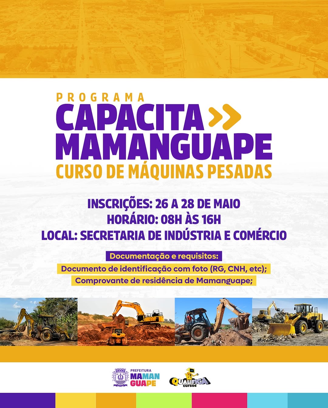 A Prefeitura de Mamanguape, por meio do programa “Capacita Mamanguape”, em parceria com o Qualifica Cursos, está com inscrições abertas para o curso gratuito de Operador de Máquinas Pesadas. As inscrições acontecem de 26 a 28 de maio.