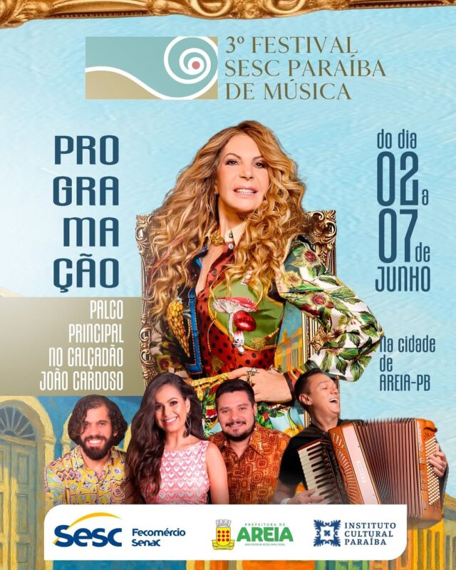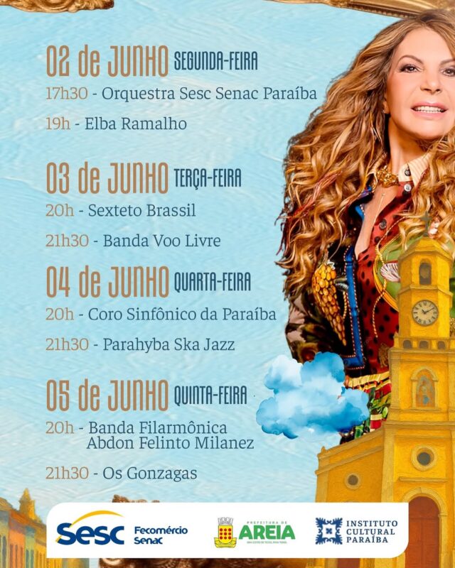 A cantora Elba Ramalho fará um show no 3º Festival Sesc Paraíba de Música, em Areia, nesta segunda-feira (2), a partir das 19h, no Calçadão Cardoso Vieira. A terceira edição do evento que começa hoje, seguirá até o dia 7 de junho.