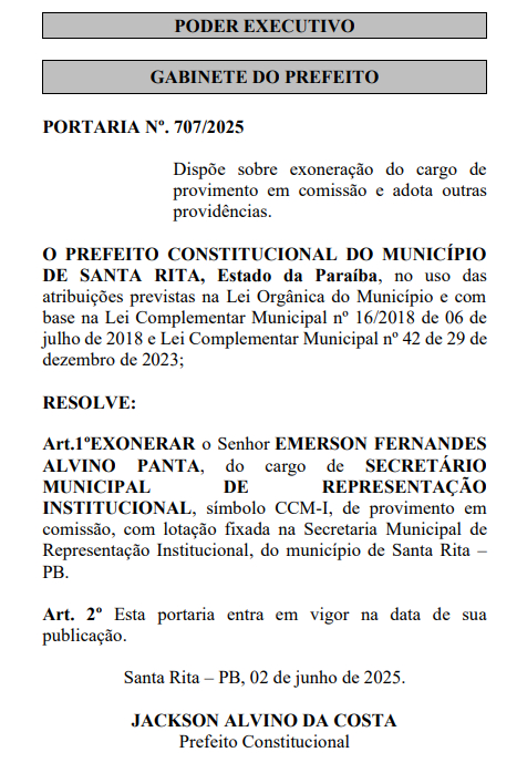 O ex-prefeito de Santa Rita, Emerson Panta, foi exonerado pelo atual gestor do cargo de secretário de Representação Institucional. A decisão do prefeito Jackson Alvino foi publicada na edição desta tarde do Diário Oficial do Município.