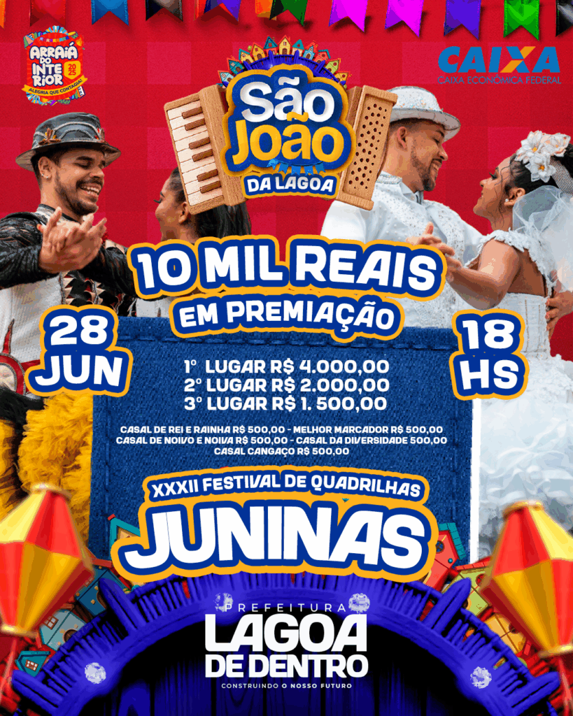 Lagoa de Dentro realiza o XXXII Festival de Quadrilhas Juninas no dia 28 de junho com R$ 10 mil em premiação