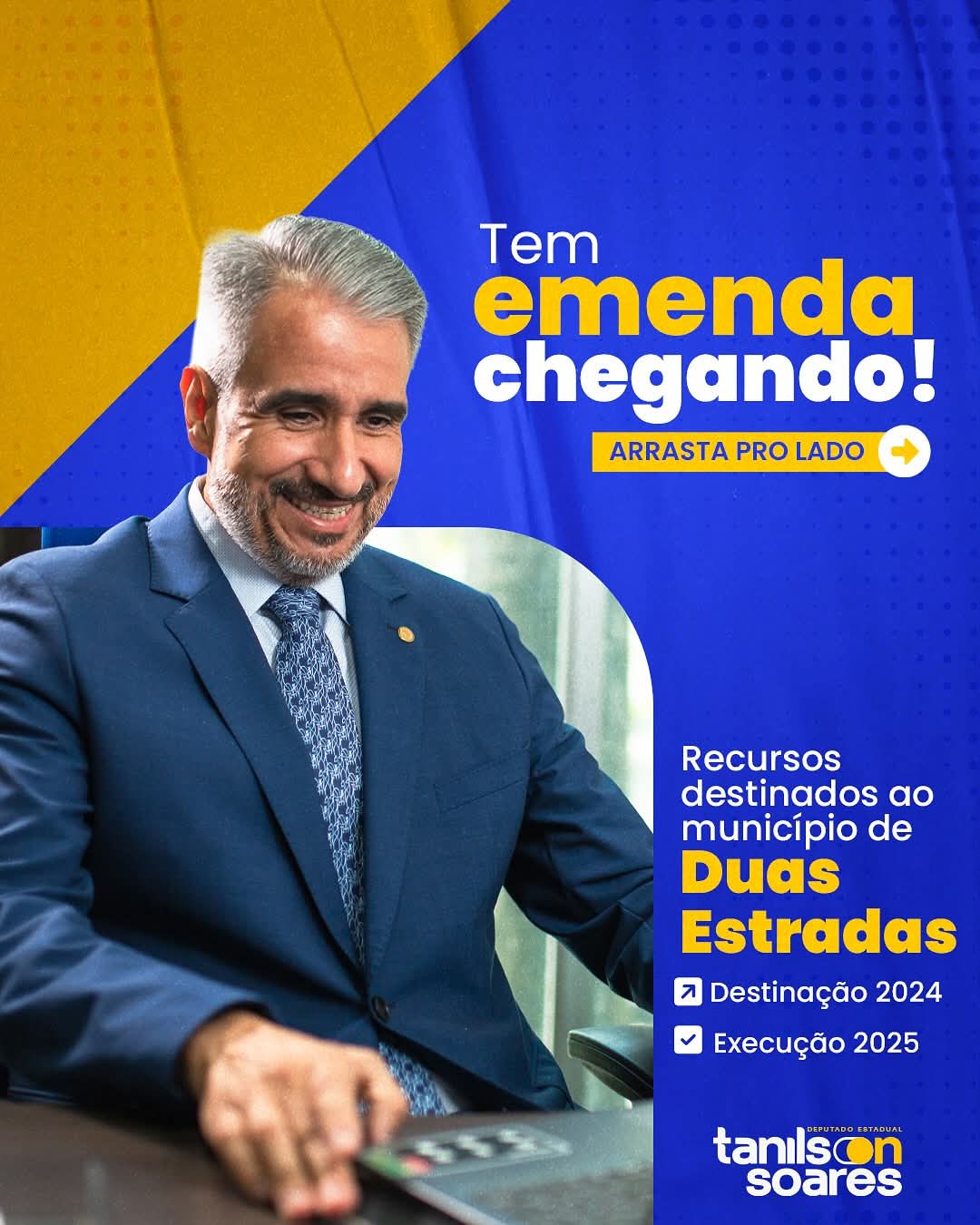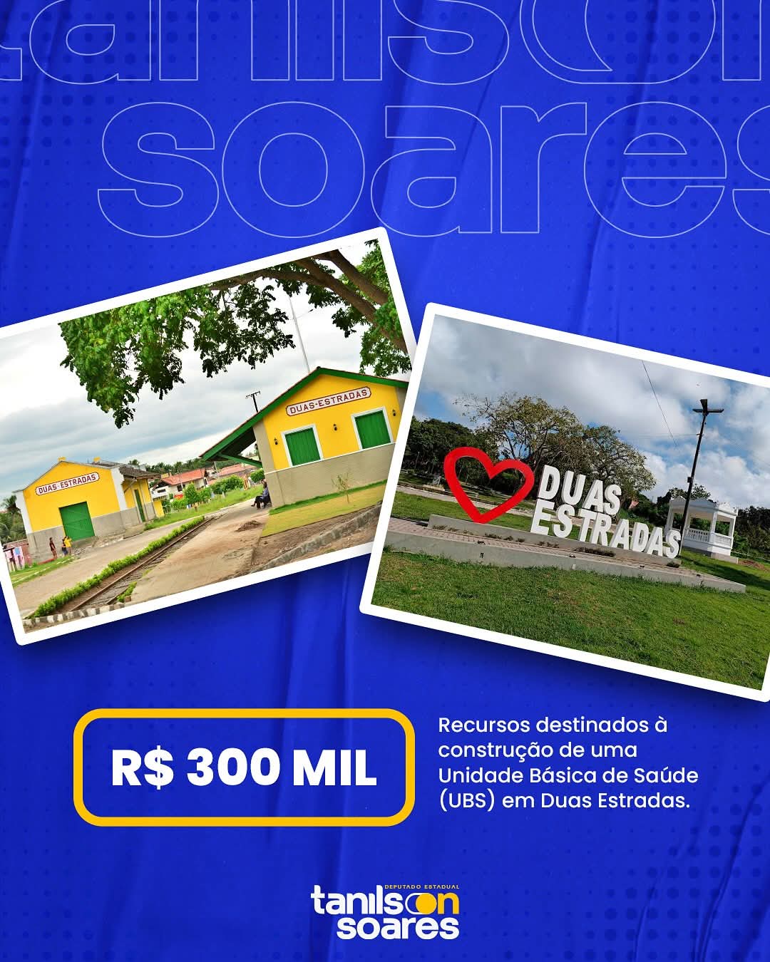 O deputado estadual Tanilson Soares anunciou a destinação de uma emenda parlamentar no valor de R$ 300 mil para o município de Duas Estradas, no interior da Paraíba. O recurso será utilizado na construção de uma nova Unidade Básica de Saúde (UBS), com o objetivo de ampliar e fortalecer os serviços de saúde oferecidos à população local.