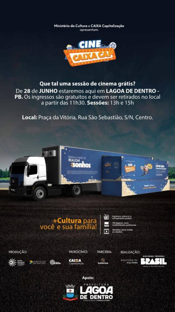 A Prefeitura de Lagoa de Dentro tem a alegria de convidar toda a população para um evento especial que promete encantar crianças, jovens e adultos: o CINE CAIXA, uma tarde de cinema ao ar livre com muita diversão, pipoca e refrigerante totalmente gratuitos! O evento acontecerá na Praça da Vitória, localizada na Rua São Sebastião, S/N, no […]
