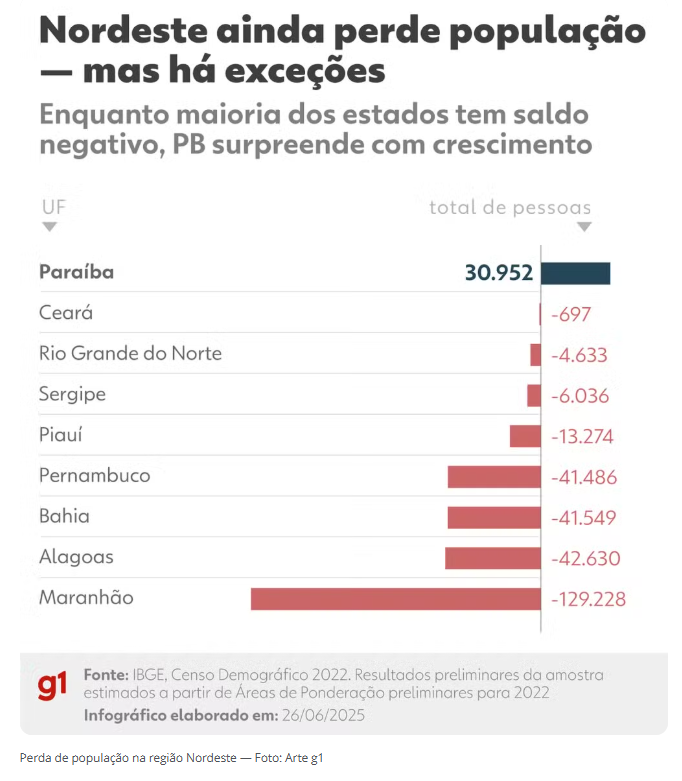 A região Nordeste mantém a tendência histórica de perda populacional para outras partes do país, sendo exceção a Paraíba. Os maiores saldos negativos foram registrados na Bahia (-41.549), em Alagoas (-42.630) e no Maranhão (-129.228).
