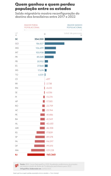 O Rio de Janeiro também teve perda significativa no saldo migratório: 165,3 mil pessoas deixaram o estado no período analisado.