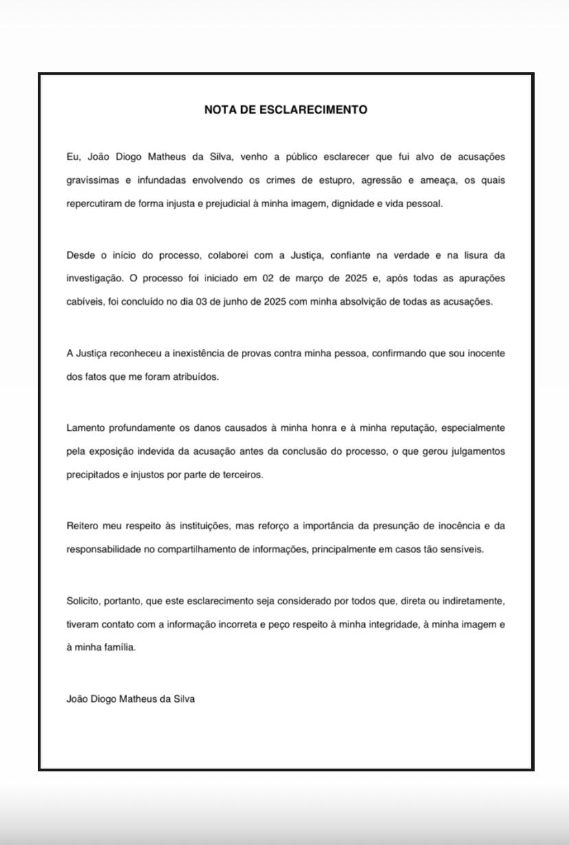 “Lamento profundamente os danos causados à minha honra e à minha reputação, especialmente pela exposição indevida das acusações antes da conclusão do processo, o que gerou julgamentos precipitados e injustos por parte de terceiros”, declarou João Diogo.