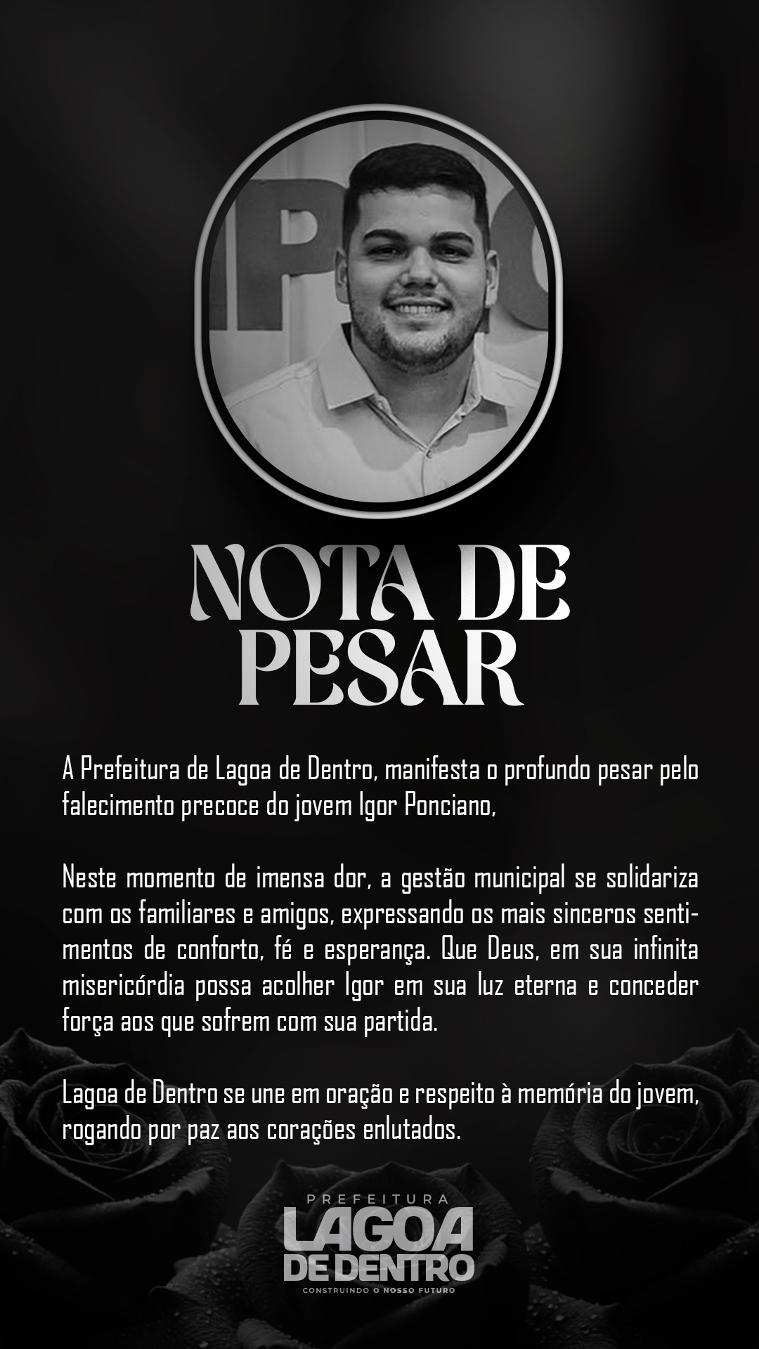 A Prefeitura Municipal de Lagoa de Dentro publicou nesta quinta-feira, 18 de julho de 2025, o Decreto Nº 82, que decreta luto oficial no município em virtude do falecimento do jovem Igor Ponciano, ocorrido no dia 17 de julho. Igor era esposo da vereadora Beatriz Freire e sua partida precoce causou grande comoção em toda a comunidade lagoadentrense.
