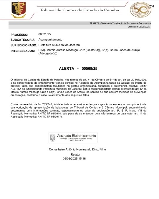 O Tribunal de Contas da Paraíba (TCE) através do conselheiro Antônio Nominado Diniz Filho, emitiu um alerta para a prefeitura de Jacaraú, litoral norte da Paraíba, para que cumpra sua obrigação no envio de balancetes e assim garanta a transparência devida aos atos financeiros do município.