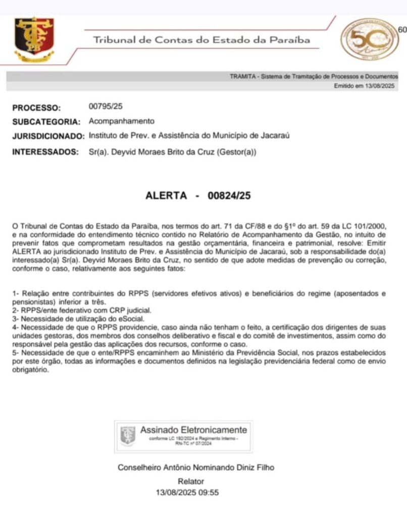 TCE-PB Aponta Risco e Falhas de Gestão no Fundo de Previdência de Jacaraú