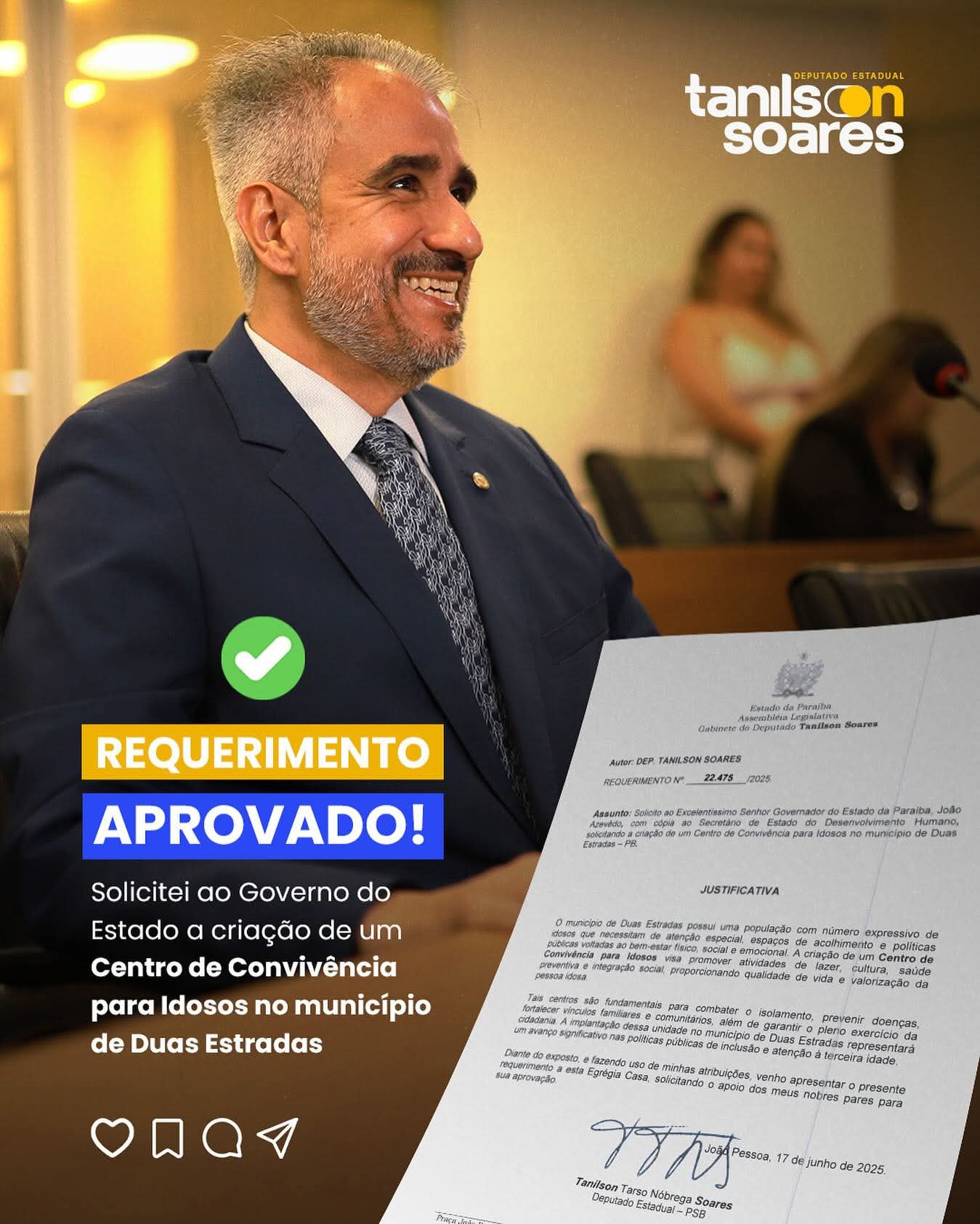 Na Assembleia Legislativa da Paraíba, o deputado estadual Tanilson Soares (PSB) comemorou a aprovação de um requerimento de sua autoria que solicita ao Governo do Estado a criação de um Centro de Convivência para Idosos no município de Duas Estradas.