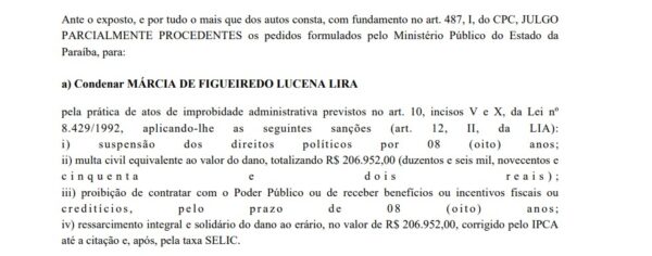 Conforme a decisão, Márcia Lucena foi condenada pela prática de atos de improbidade administrativa. Com isso, ficou determinada a suspensão dos seus direitos políticos por oito anos e pagamento de uma multa equivalente ao valor do dano, totalizando R$ 206.952.