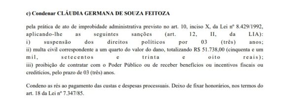 Claudia Germana de Souza Feitoza também foi condenada pela prática de ato de improbidade administrativa com suspensão dos direitos políticos por três anos, multa civil correspondente a um quarto do valor do dano, totalizando R$ 51.738,00. A sentença também prevê a proibição de contratar com o Poder Público ou receber benefícios e incentivos fiscais ou creditícios, pelo prazo de três anos.