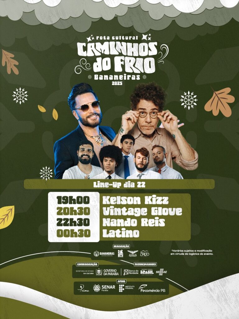 O município de Bananeiras, no Brejo paraibano, será palco de mais uma noite inesquecível no Caminhos do Frio 2025. Nesta sexta-feira (22), a cidade vai ferver no clima acolhedor da serra com dois grandes nomes da música brasileira: Nando Reis e Latino, que prometem agitar moradores e turistas em um dos festivais culturais mais esperados […]