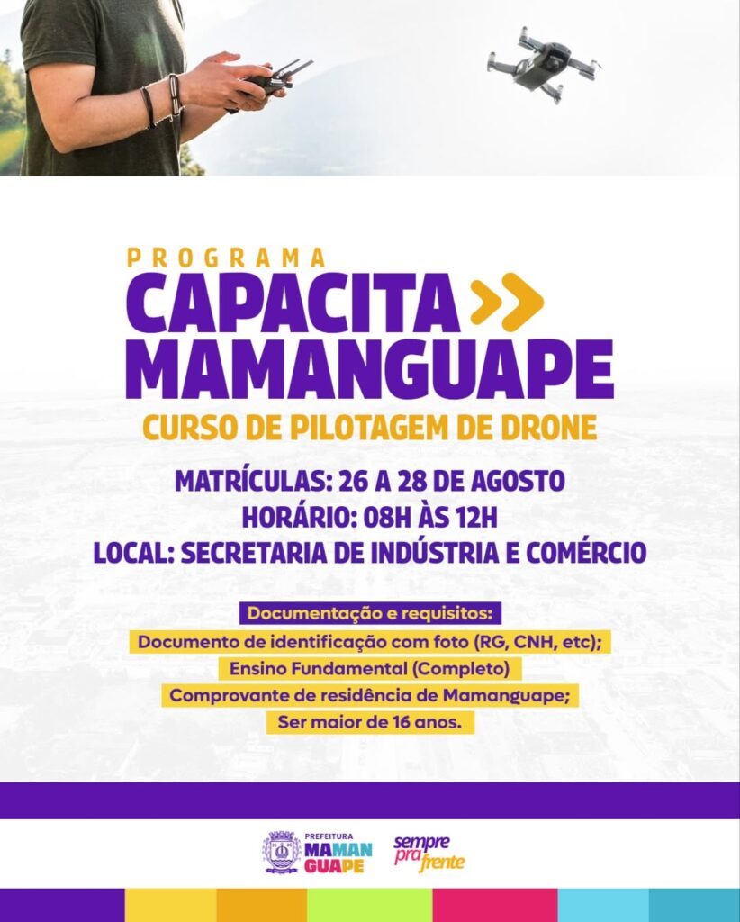 A Prefeitura de Mamanguape, por meio do Programa Capacita Mamanguape, está com inscrições abertas para o Curso de Pilotagem de Drone, uma excelente oportunidade de qualificação. O período de inscrições acontecerá de 26 a 28 de agosto, das 08h às 12h, na Secretaria de Indústria e Comércio. Voltado para jovens e adultos, o curso tem como […]