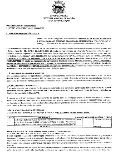 O município de Riachão, no Agreste da Paraíba, fechou contrato no valor de R$ 200 mil para um show. A informação, como observou o ClickPB, consta no sistema Tramita do Tribunal de Contas do Estado (TCE-PB).