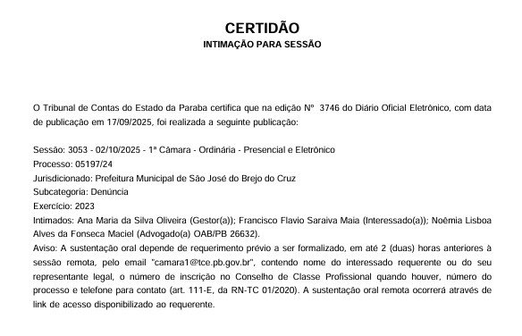 Com isso, foi aplicada de multa pessoal à ex-gestora, além da recomendação à atual gestão de São José do Brejo do Cruz para serem observados todos os requisitos exigidos pela legislação aplicável na contratação de serviços jurídicos por inexigibilidade de licitação.