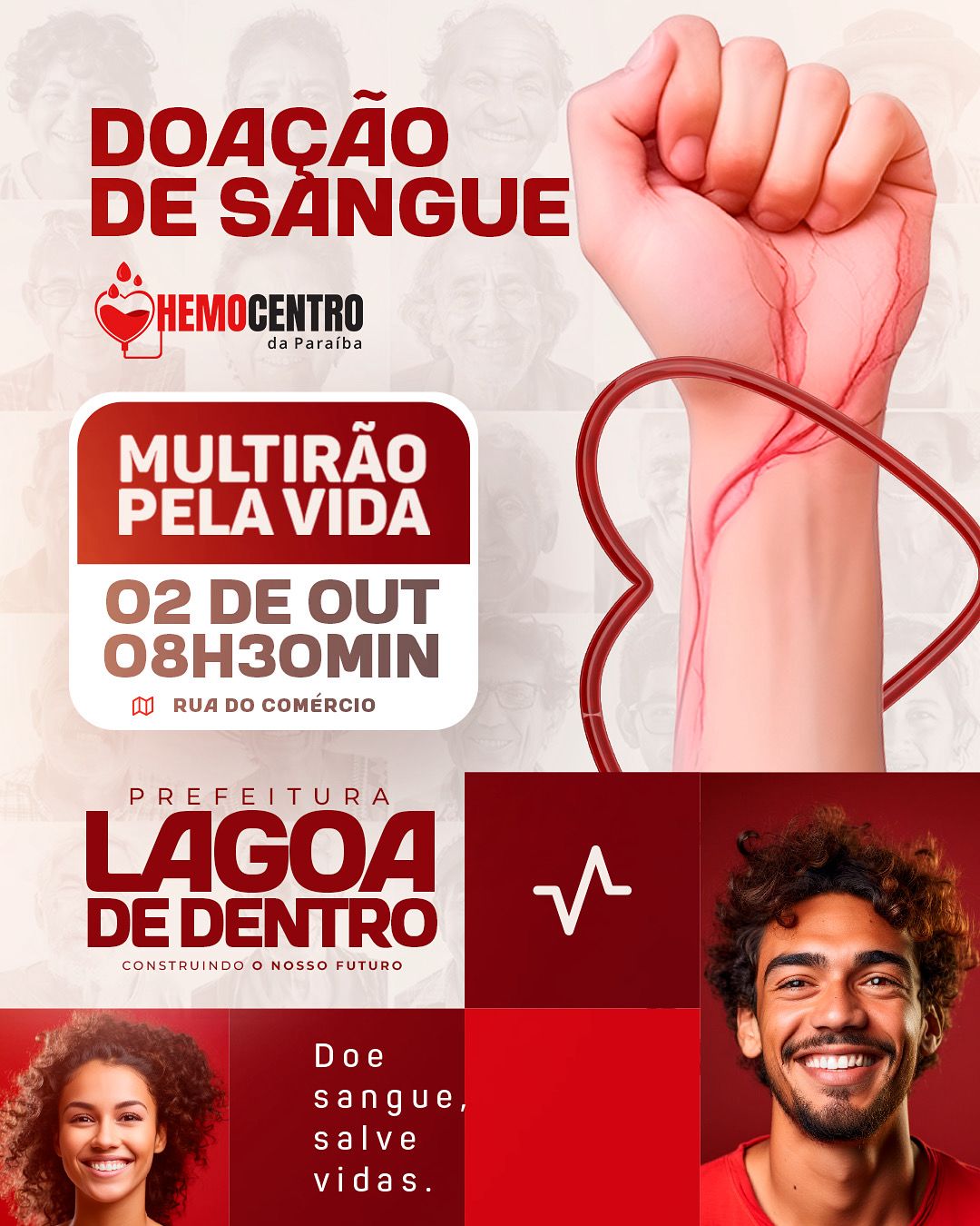 A Prefeitura de Lagoa de Dentro convida toda a população para participar de um dia especial dedicado à solidariedade e ao cuidado com a vida: a Campanha de Doação de Sangue, que será realizada nesta quinta-feira, 02 de outubro, na Rua do Comércio, ao longo de todo o dia.