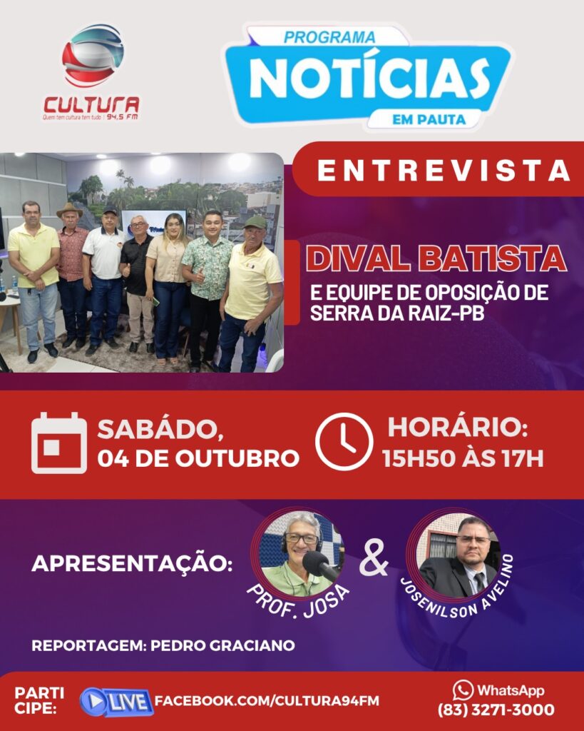 O empresário e líder de oposição de Serra da Raiz, Dival Batista estará concedendo uma entrevista ao programa ‘Notícias em Pauta’ da Rádio Cultura FM, neste sábado (04), a partir dás 16h00 na cidade de Guarabira. Na ocasião, Dival estará acompanhado do Ex-vereador Valdir Goiana e todo o grupo de oposição, onde fará um balanço […]