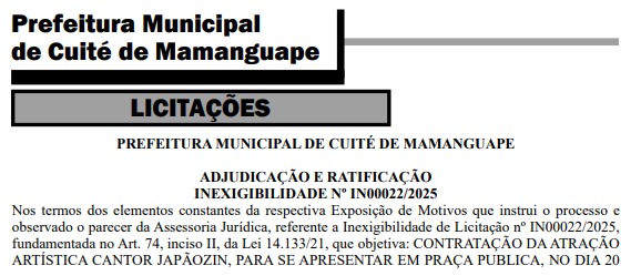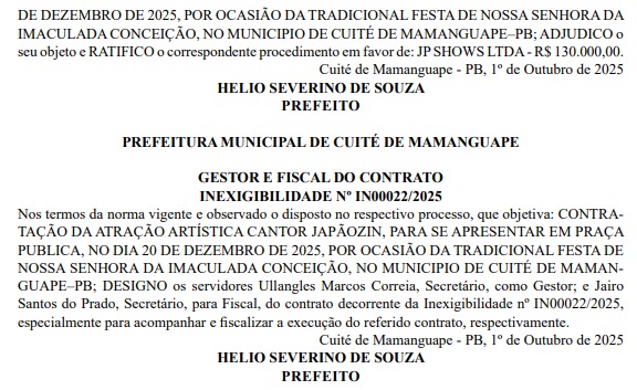 Prefeitura de Cuité de Mamanguape, no Litoral Norte da Paraíba, irá desembolsar R$ 130 mil no contrato do show do cantor Japãozin. A licitação foi publicada no Diário Oficial do Estado (DOE) desta quinta-feira (2).