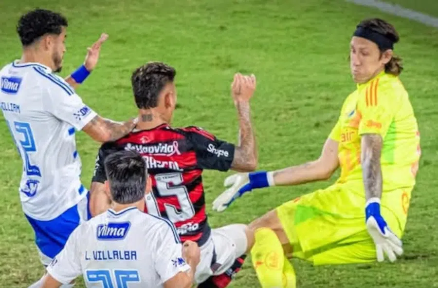 Em cruzamento doce de Carrascal que parou na cabeça de Samuel Lino, o goleiro se esticou e operou um milagre no Maracanã. A jogada fez o Cruzeiro reagir, e o trio Matheus Pereira-Kaio Jorge-Matheus Henrique tentou, sem sucesso, vencer Rossi.