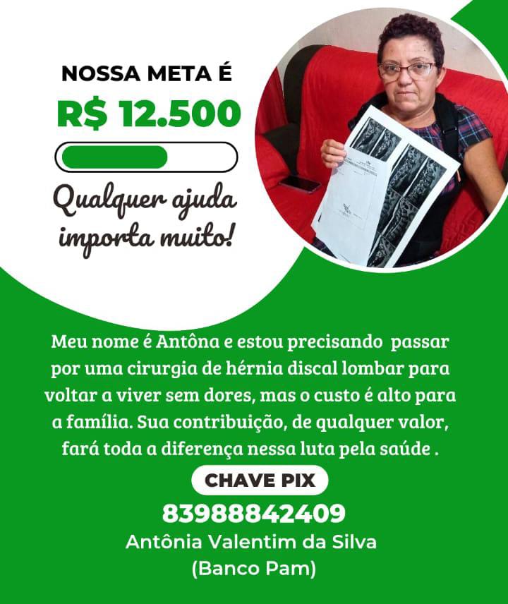 Campanha Solidária: Antônia da cidade de Itapororoca, luta contra uma hérnia discal lombar e precisa de ajuda urgente para cirurgia