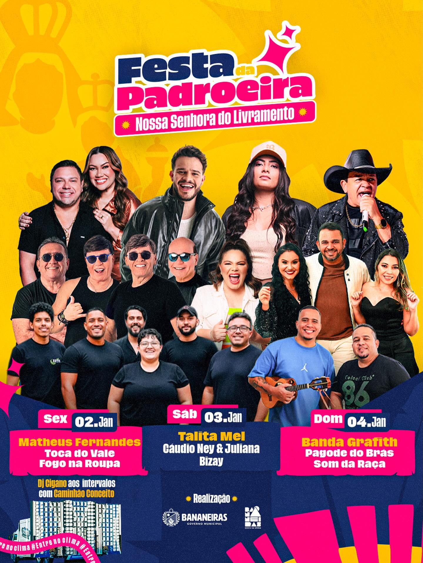 Bananeiras vai começar 2026 com muita música, fé e celebração! Durante as comemorações dos 146 anos de Emancipação Política, o prefeito do município anunciou oficialmente as atrações da tradicional Festa da Padroeira de Nossa Senhora do Livramento, que acontecerá nos dias 02, 03 e 04 de janeiro de 2026.