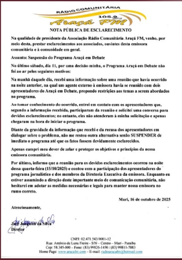 Na nota divulgada nesta quinta-feira (16), Zezinho do Evangelho confirmou a existência de censura prévia, declarando abertamente que continuará “controlando” os conteúdos deixando subtender que vai interferir diretamente na linha editorial dos programas jornalísticos da casa. A atitude, que afronta a Constituição Federal e a Lei de Radiodifusão, é vista pela opinião pública como uma tentativa clara de implantar uma “lei da mordaça” na Araçá FM.