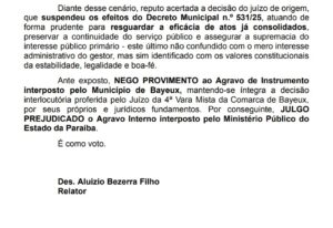 A decisão foi proferida no julgamento do Agravo de Instrumento nº 0812247-15.2025.8.15.0000, sob relatoria do desembargador Aluízio Bezerra Filho, que negou provimento ao recurso do Município e preservou a sentença da 4ª Vara Mista de Bayeux, a qual havia suspendido o decreto e fixado multa em caso de descumprimento.