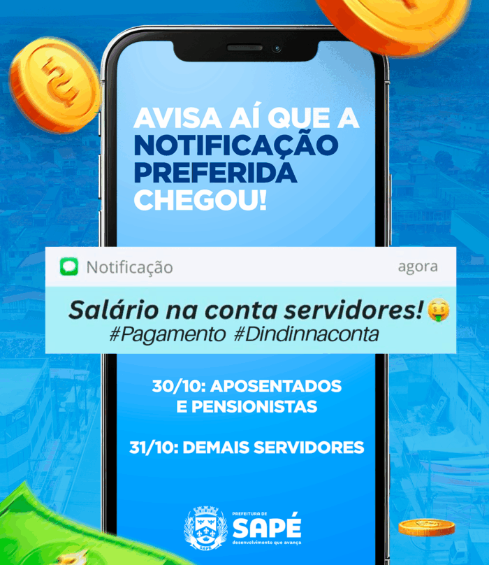 A Prefeitura de Sapé mantém seu compromisso com os servidores municipais ao efetuar o pagamento dos salários de outubro dentro do mês trabalhado. Os depósitos serão realizados nesta quinta (30) para aposentados e pensionistas, enquanto os demais servidores terão seus salários creditados na sexta-feira (31).
