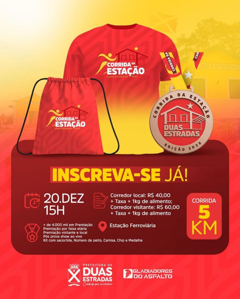 A tradicional Corrida da Estação Duas Estradas 2025 será realizada no dia 20 de dezembro, a partir das 15h, na estação ferroviária do município. O evento esportivo reunirá corredores locais e visitantes em um percurso de 5 quilômetros, com mais de R$ 4 mil em premiações, além de atrações musicais e estrutura completa para os […]