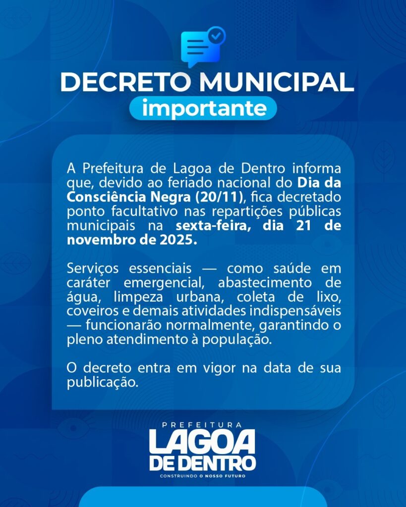 A Prefeitura de Lagoa de Dentro publicou, nesta segunda-feira (17), o decreto que estabelece ponto facultativo nas repartições públicas municipais na sexta-feira, dia 21 de novembro de 2025. A medida foi assinada pelo Prefeito Constitucional do Município, em conformidade com o que estabelece o art. 73, inciso II, da Lei Orgânica Municipal. O decreto leva em […]