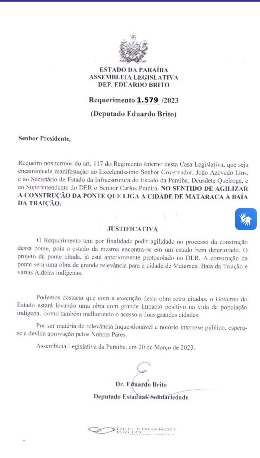 O requerimento n.º 1.579/2023, apresentado por Brito na Assembleia Legislativa da Paraíba, solicitava agilidade no processo de execução da ponte, destacando o estado deteriorado da estrutura atual e o impacto direto na mobilidade da população. O pedido foi encaminhado ao governador João Azevêdo, ao secretário de Infraestrutura, Deusdete Queiroga, e ao superintendente do DER, Carlos Pereira.