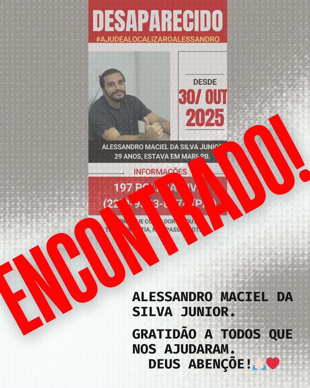 Alessandro Maciel da Silva Júnior, 29 anos, natural do Rio de Janeiro e desaparecido desde 30 de outubro, foi encontrado com vida no Recife (PE) após quase um mês sem contato com a família. Ele havia saído da residência da mãe, em Mari (PB), e não retornou.