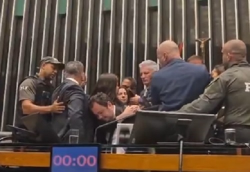 O Departamento de Polícia Legislativa (Depol) retirou o parlamentar da mesa à força após sua intervenção, enquanto deputados de esquerda tentaram impedir a ação.