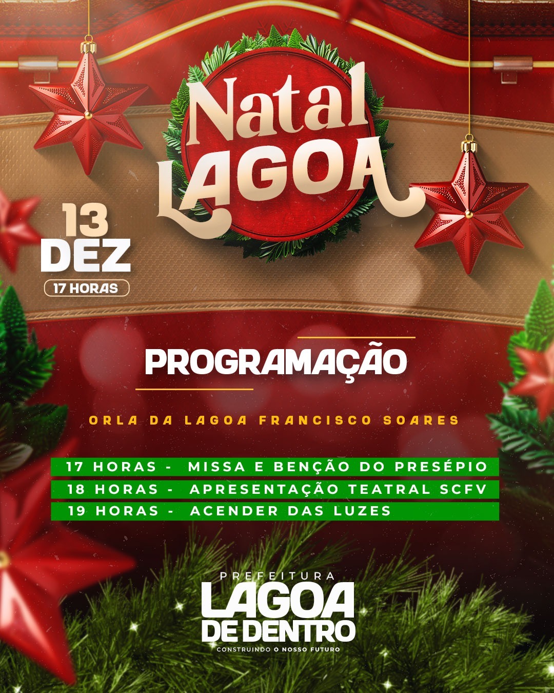 A Prefeitura de Lagoa de Dentro convida toda a população para participar do Natal Lagoa 2025, um evento especial preparado para celebrar o nascimento de Jesus, fortalecer a fé, valorizar a cultura e promover momentos de emoção e confraternização entre as famílias do município. A programação acontece neste dia 13 de dezembro.
