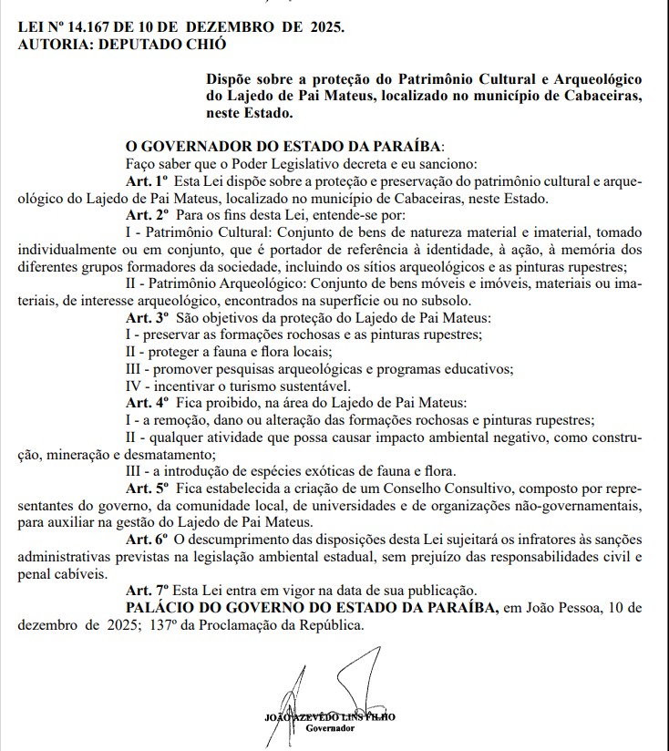 O governador João Azevêdo sancionou nesta quinta-feira (11) a Lei que dispõe sobre a proteção do Patrimônio Cultural e Arqueológico do Lajedo do Pai Mateus, localizado em Cabaceiras, Cariri da Paraíba. A proposta de lei é de autoria do deputado estadual Chió e entra em vigor a partir de sua publicação.