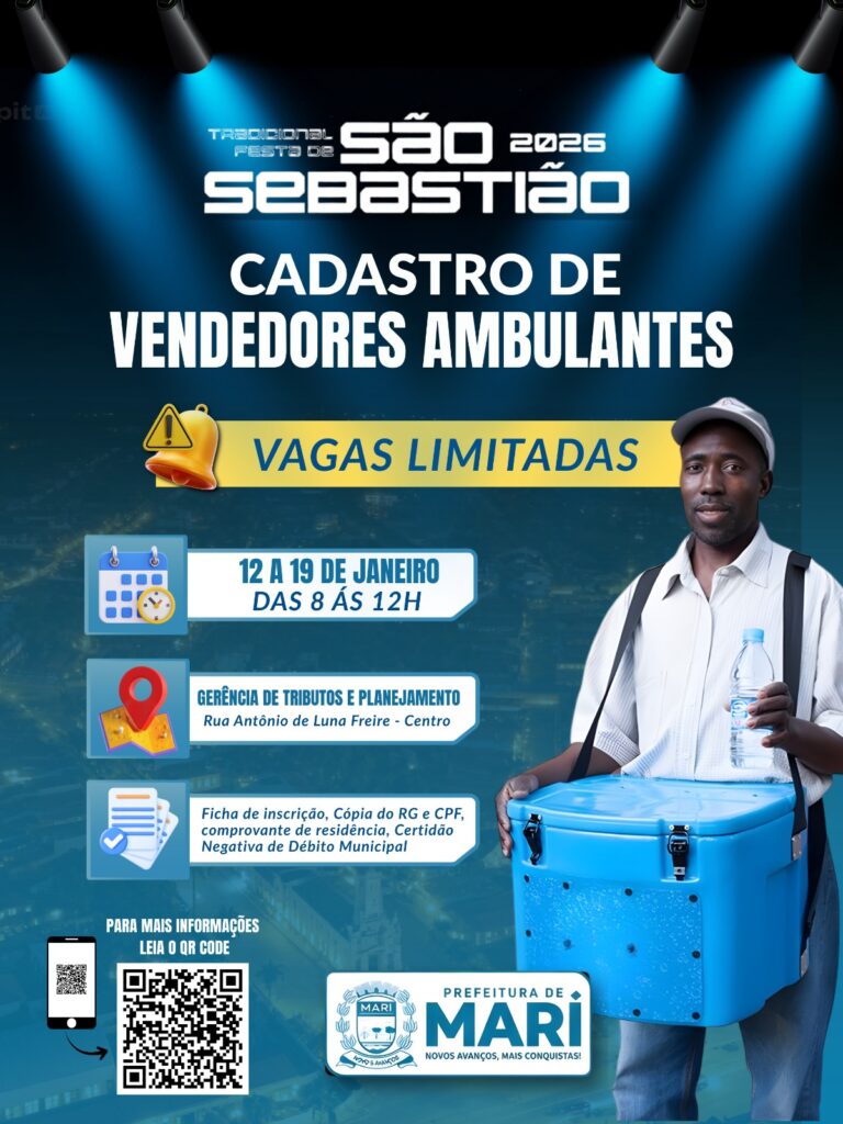 A Prefeitura de Marí deu início ao cadastro de ambulantes interessados em atuar na Tradicional Festa de São Sebastião 2026, um dos eventos religiosos e culturais mais importantes do município. A iniciativa garante organização, segurança e oportunidade de renda para comerciantes informais durante os dias de festa. Os trabalhadores que desejam comercializar produtos durante o […]