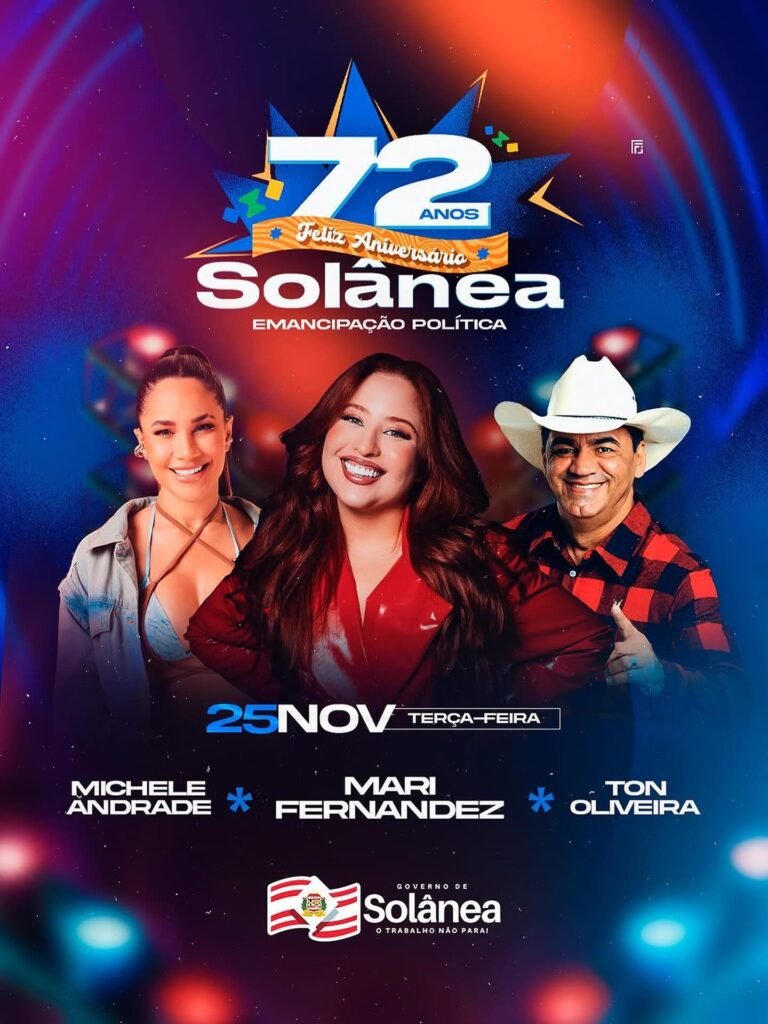 Solânea comemora 72 Anos de Emancipação com grandes shows nesta terça (25): Michele Andrade, Mari Fernandes e Ton Oliveira novembro 25, 2025 Leia Mais...